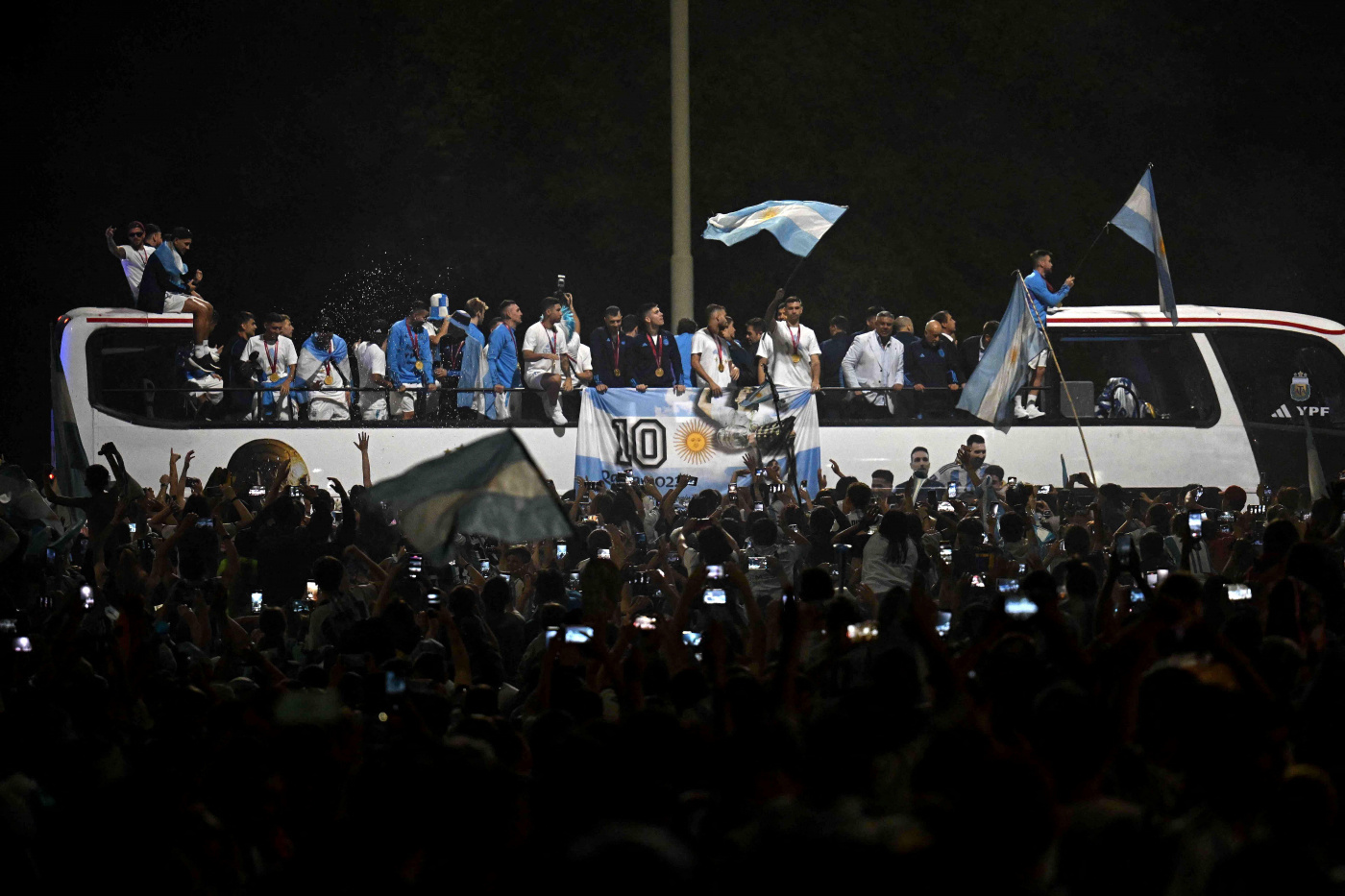 Zbritën në tapetin e kuq dhe shkuan drejt e në autobusin që i priste për t’i çuar në selinë e Federatës. De Paul, Dibu Martínez, Lautaro Martínez, Nicolás Otamendi dhe Julián Álvarez u ngjitën në çatinë e autobusit. Skuadra kaloi nën harkun e triumfit me mbishkrimin “Grazie Campioni”.