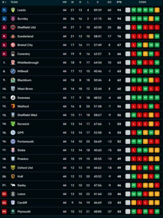 Me pikë të njëjta, Burnley rikthehet në Premierligë pas një sezoni, pasi fitoi ndeshjen direkte me Sheffield United, me rezultat 2-1.