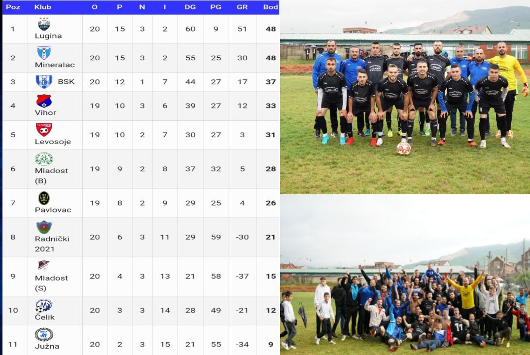 Në ndeshjen e fundit të kampionatit, Lugina ka fituar me rezultat të thellë 7-0 ndaj Radniçkit të Vrajës për ta mbyllur kampionatin si lider në Rrethin e Pçinjës.
