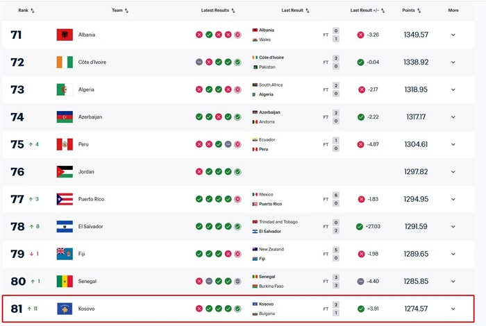 Falë fitoreve ndaj Gjibraltarit dhe Kroacisë, si dhe dy fitoreve ndaj Bullgarisë javën e kaluar, Kosova ka grumbulluar 58,33 pikë.