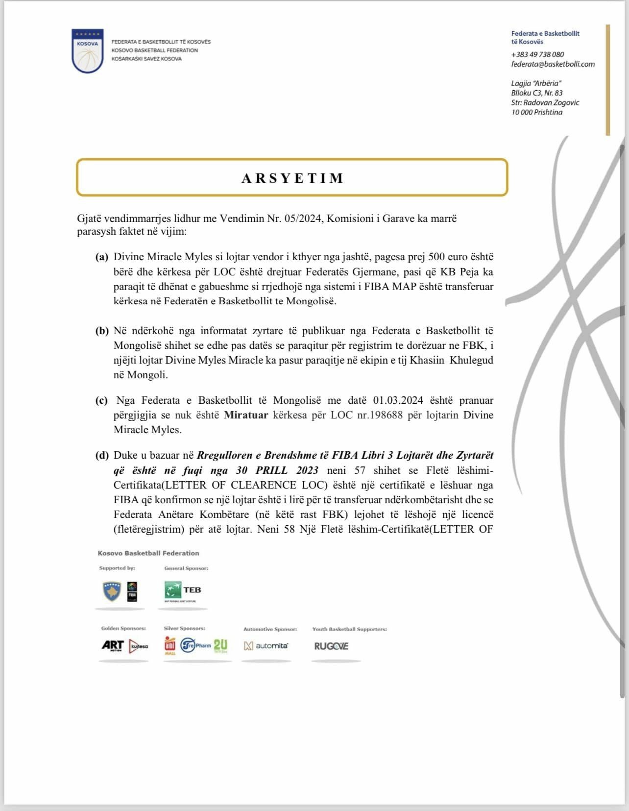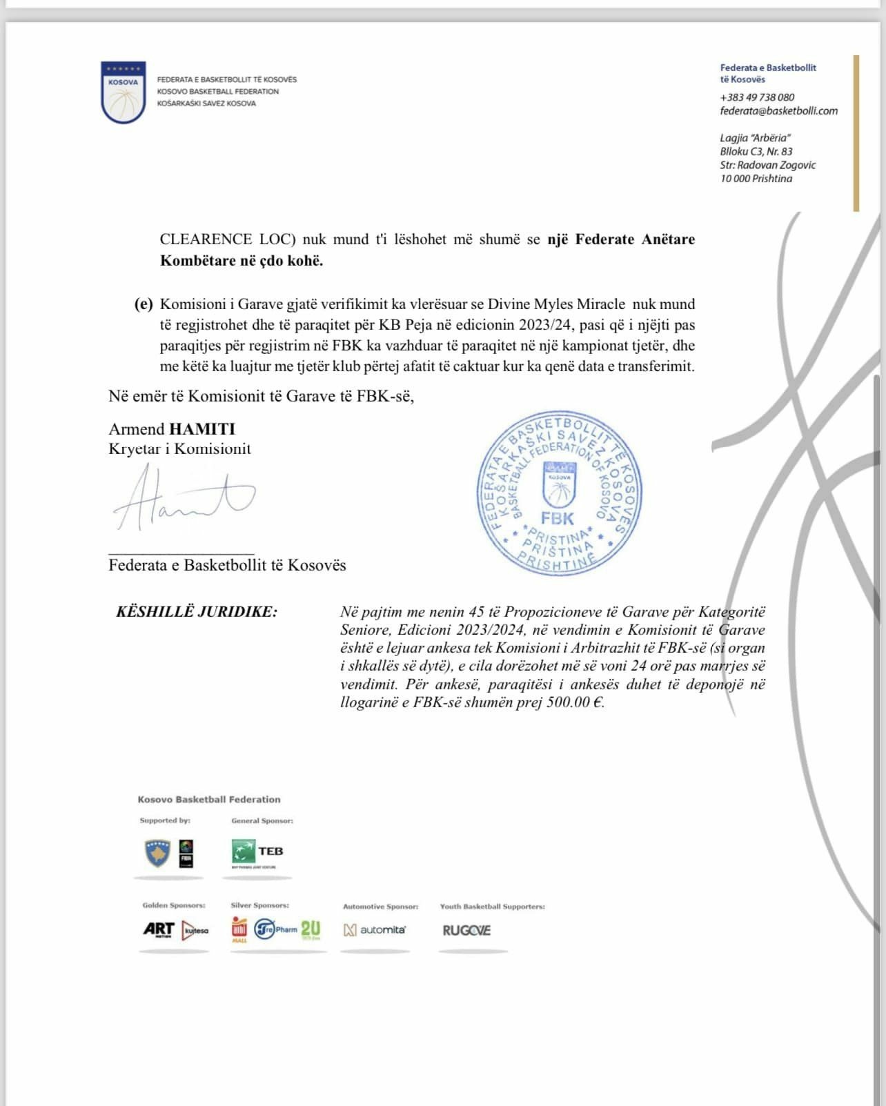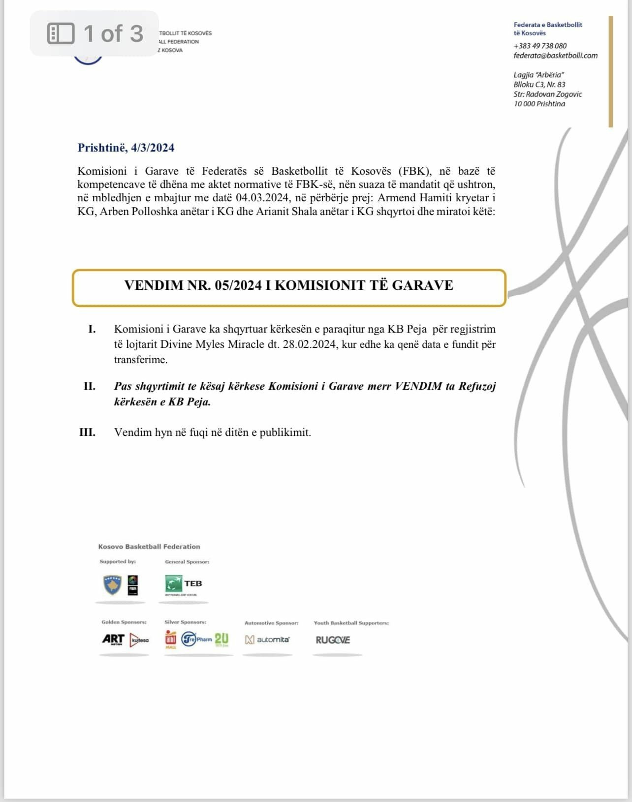 “Komisioni i Garave në kuadër të FBK-së e ka shqyrtuar kërkesën e paraqitur KB Peja, për regjitstrim të Divine Myles Miracle dt.28.02.2024, kur ka qenë edhe dita e fundit për transferime.