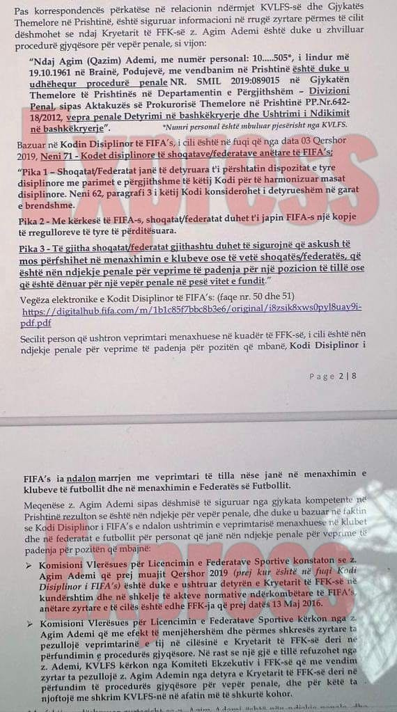 Në letër thuhet se komisioni përmes rrugëve zyrtare e ka vërtetuar që Agim Ademi është në proces gjyqësor dhe se si rezultat i kësaj FFK nuk mund të licencohet, pasi kjo do të binte ndesh me ligjet e Republikës së Kosovës, me statutin e FFK-së dhe me kodin etik të FIFA, të cilin FFK është i obliguar me statut dhe ligje të Kosovës e UEFA-s dhe FIFA-s ta respektojë.