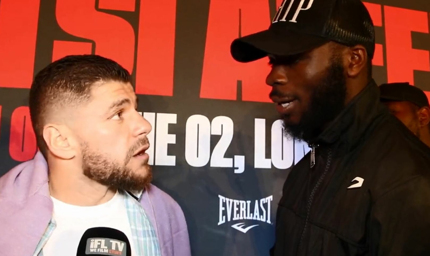 Në momentin e intervistës, iu afrua boksieri Chris Kongo, i cili po e pengonte.