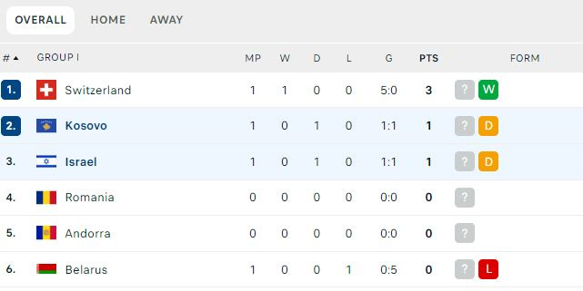 Me këtë barazim, Kosova është e dyta në grup me një pikë, aq sa ka edhe Israeli në pozitën e tretë.