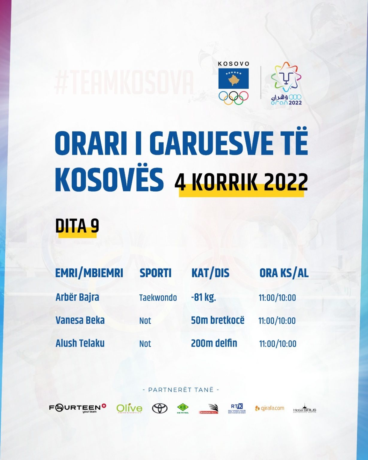 Fillimisht garën e fillon Arbër Bajra në taekwondo, ndërsa më pas Vanesa Beka dhe Alush Telaku në not.