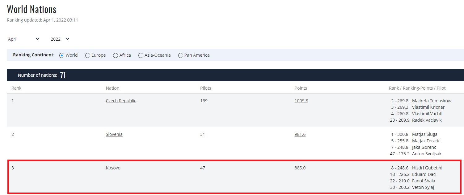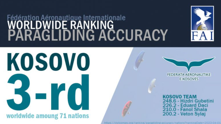 Në mesin e 71 shteteve garuese anëtare të Federatës Ndërkombëtare të Aeronautikës, shteti i Kosovës ka arritur të renditet në vendin e tretë në paragllajdizëm precizion.