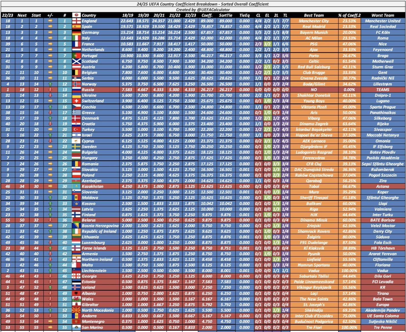 Kosova tani renditet në vendin e 33-të në Evropë, duke llogaritur koeficientet e klubeve që marrin pjesë në garat ndërkombëtare, duke lënë mbrapa kampionatet rivale si Shqipëria, Maqedonia e Veriut dhe Mali i Zi.