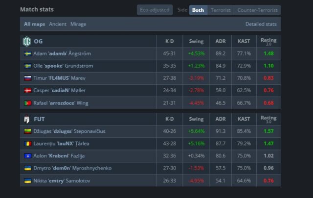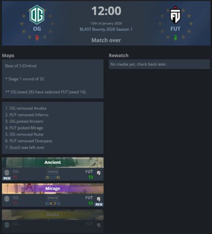 Një duel i fort shkoi edhe në ‘Mirage’ map të zgjedhur nga FUT, ku rezultati ishte i njëjtë sikurse në ‘Ancient’ (13:11), me skuadrën e ‘Krabeni’ që triumfoi dhe siguroi fitoren e parë në ‘Blast Bounty’ një prej eventeve më të mëdha në CS2.