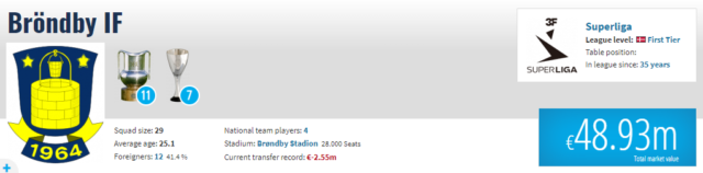 Sipas Transfermarkt, Brondby vlen afërisht 50 milionë euro dhe në gjirin saj ka lojtarë që lejnë nga 5 0se 6 milionë euro.