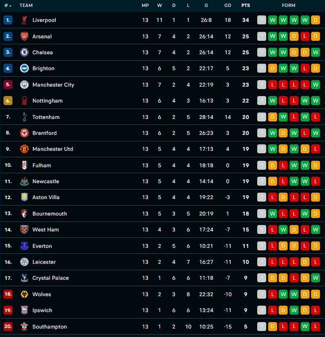 Pas 13 xhirosh, “The Reds” janë liderë me 34 pikë nëntë më shume se Chelsea e Arsenali, kurse Man City ka 23 sosh dhe ndodhet në pozitën e pestë./Arbresh.info