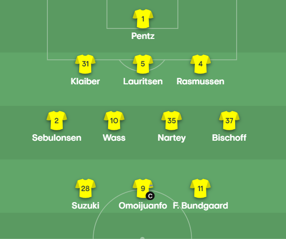 Brondby: Pentz, Klaiber, Lauritsen, Rasmussen, Sebulonsen, Ëass, Nartey, Bischoff, Suzuki, F.Bundgaard, Omoijuanfo.