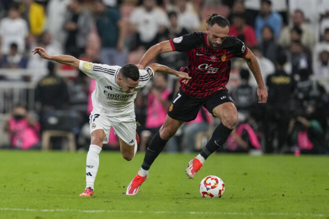 Mallorca's Vedat Muriqi, right, is challenged by Real Madrid's Lucas Vazquez during the Spanish Super Cup semifinal soccer match between Real Madrid and Mallorca at the King Abdullah Stadium in Jeddah, Saudi Arabia, Thursday, Jan. 9, 2025. (AP Photo/Altaf Qadri)