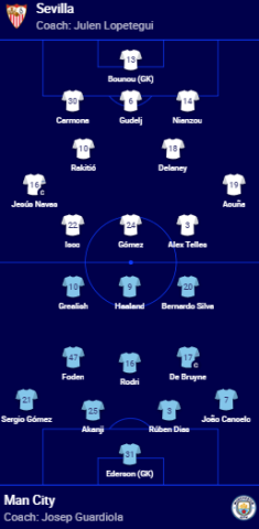 Formacioni startues i Manchester Cityt: Ederson; Cancelo, Rúben Dias, Akanji, Sergio Gómez; De Bruyne, Rodri, Bernardo Silva; Grealish, Haaland, Foden.