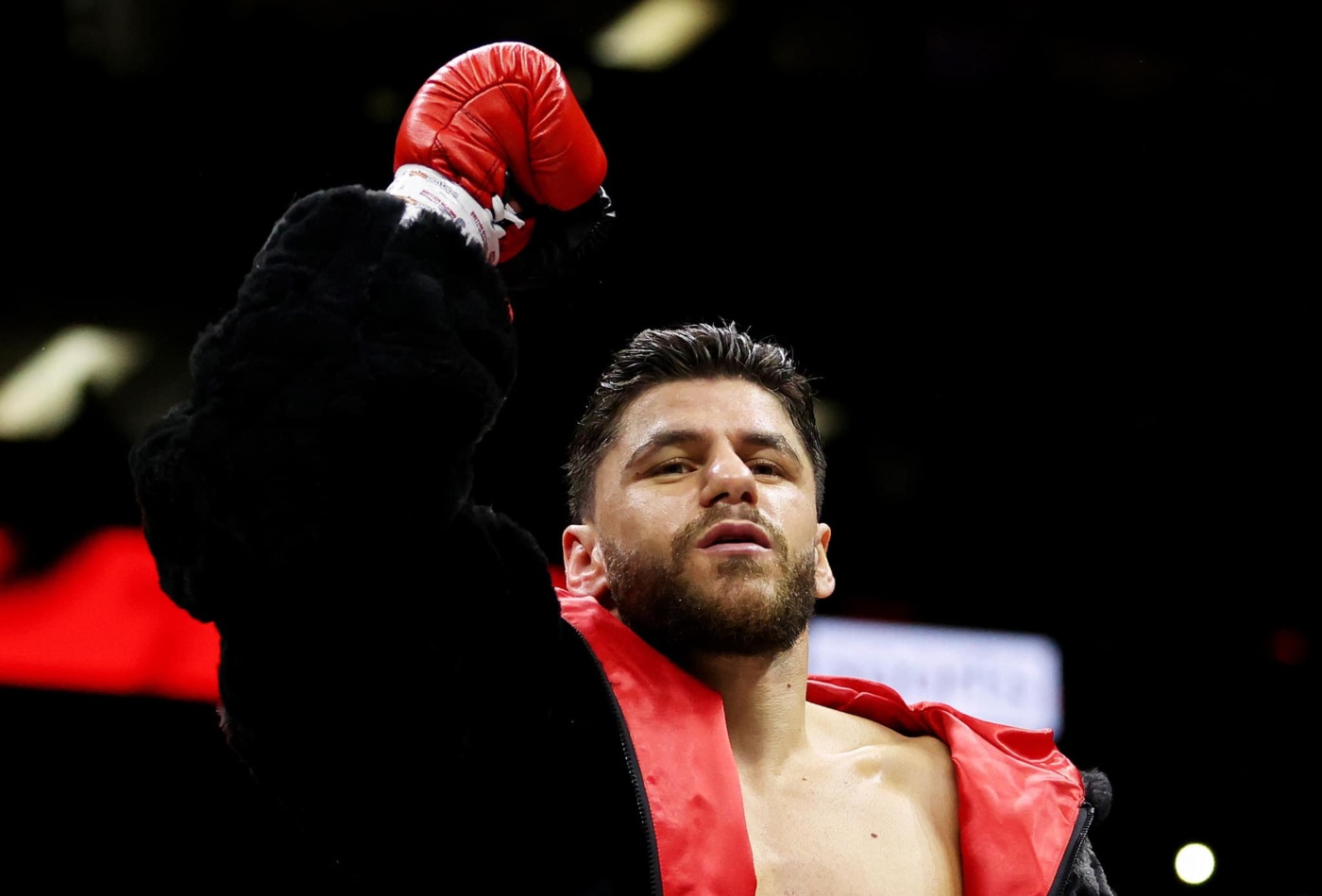 LONDON, ENGLAND - MARCH 31: Florian Marku acknowledges the fans as he enters the ring prior to the IBO Inter-Continental Welterweight Title fight between Florian Marku and Chris Kongo at The O2 Arena on March 31, 2024 in London, England. (Photo by James Chance/Getty Images)