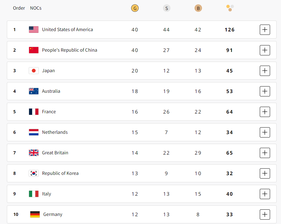Me triumfin e basketbollisteve amerikane në finale ndaj francezeve, SHBA-ja doli në vend të parë me 40 medalje të arta, 44 të argjendta e 42 të bronzta, pra gjithsej i kanë 126 medalje të fituara.