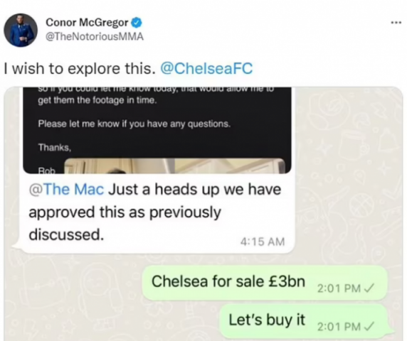 Ylli i UFC-së ndau një fotografi të një bisede në “WhatsApp”, në të cilën ai i tha dikujt se Chelsea ishte në shitje për 3 miliardë funte dhe se ata “duhet ta blejnë atë”.