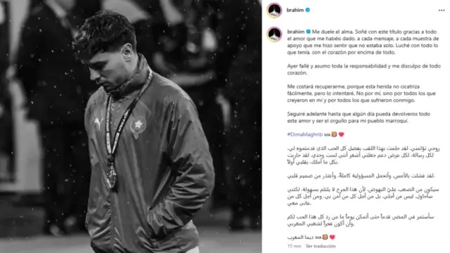 “Më dhemb shpirti. Dje gabova dhe e marr të gjithë përgjegjësinë. Kërkoj falje nga zemra”, shkroi Brahim, duke shprehur dhimbjen e madhe për një rast historik të humbur, veçanërisht pasi finalja u zhvillua në tokën marokene.
