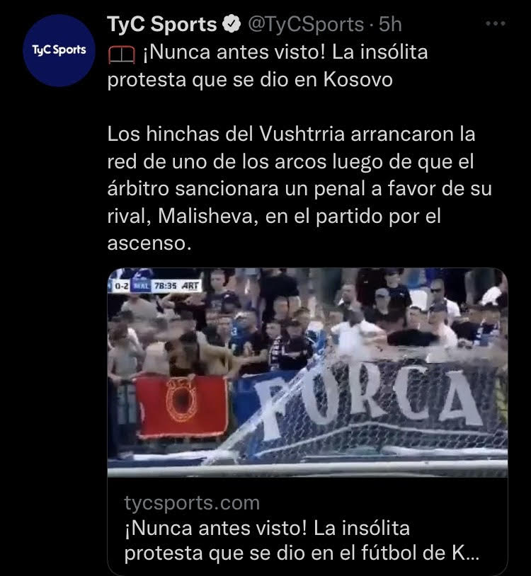 Mediumi TyC Sports i ka kushtuar një artikull këtij incidenti, aty ku tifozët vushtrrias shqyen rrjetën dhe shkatërruan ulëset e stadiumit “Zahir Pajaziti” në Podujevë.