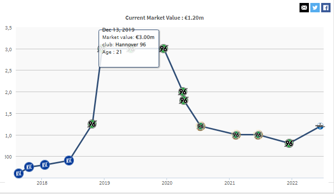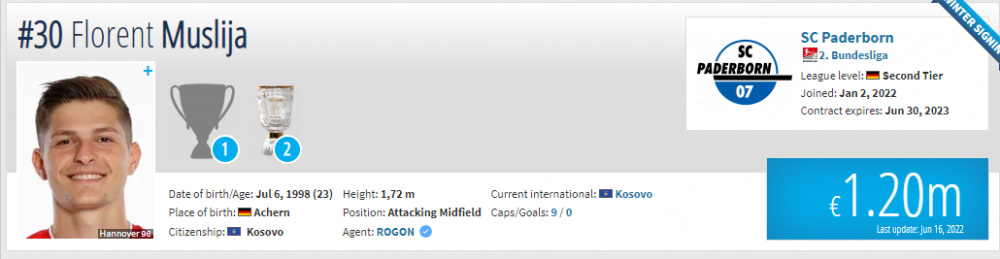 Vlera më e lartë e Muslijës ishte 3 milionë euro, gjatë vitit 2019, kur luante për Hannoverin. /arbresh.info/
