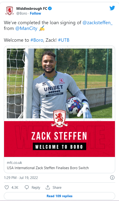Middlesbrough e ka kompletuar huazimin e portierit të Manchester Cityt, Zackary Steffen.