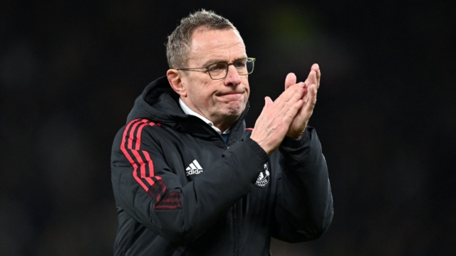 Manchester United German Interim head coach Ralf Rangnick applauds as he leaves after the English Premier League football match between Manchester United and Wolverhampton Wanderers at Old Trafford in Manchester, north west England, on January 3, 2022. - Wolves won the game 1-0. (Photo by Paul ELLIS / AFP) / RESTRICTED TO EDITORIAL USE. No use with unauthorized audio, video, data, fixture lists, club/league logos or 'live' services. Online in-match use limited to 120 images. An additional 40 images may be used in extra time. No video emulation. Social media in-match use limited to 120 images. An additional 40 images may be used in extra time. No use in betting publications, games or single club/league/player publications. / (Photo by PAUL ELLIS/AFP via Getty Images)