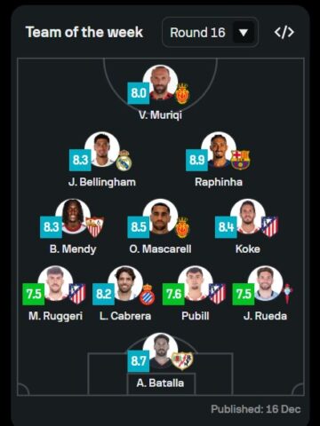 Falë kësaj paraqitje ai zuri vend në formacionin e javës së 16-të në La Liga sipas faqes së specializuar të statistikave SofaScore.