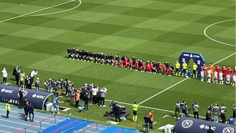 Lojtarët e Napolit më pas ‘u gjunjëzuan’ gjatë himnit të Lega Serie A, si një përgjigje për autoritetet. /Telegrafi/