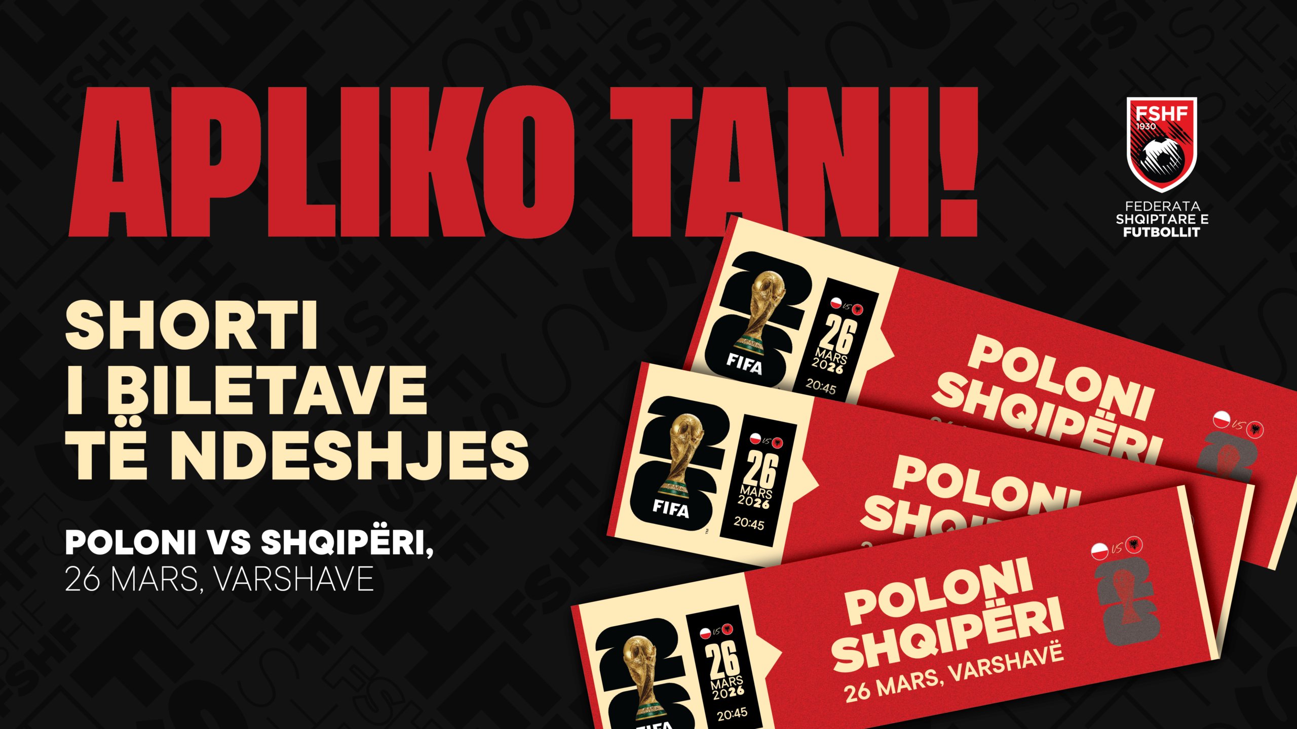 Federata Shqiptare e Futbollit njofton të gjithë tifozët se është hapur procesi i aplikimit për shortin e biletave për ndeshjen Poloni – Shqipëri, e vlefshme për fazën play-off të Kampionatit Botëror 2026, që do të luhet më 26 mars në Varshavë.