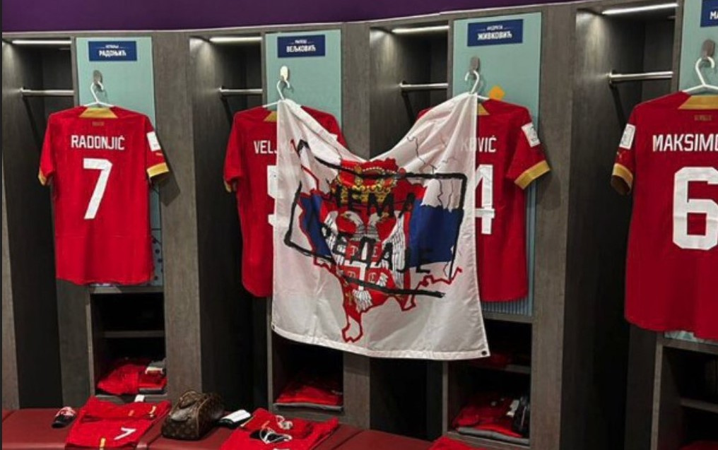 Në një foto që po qarkullon në internet, në zhveshtoren e kombëtares serbe, pos fanellave, gjendet edhe një flamur, që përmban hartën e Kosovës me ngjyra të Serbisë.