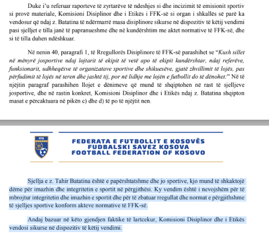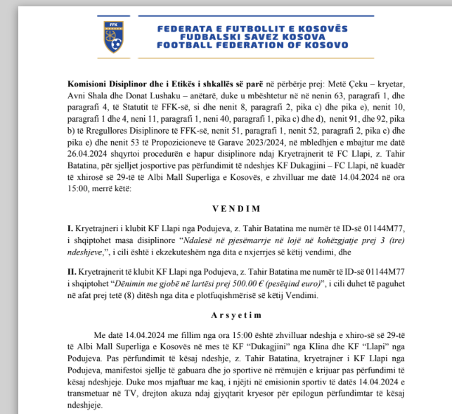 Gjatë ditës së sotme, FFK-ja e dënuar kryetrajnerin e Llapit me tri ndeshje, për arsye të një deklaratë në një emisionin sportiv ‘Favorit’ në T7, shkruan Arbresh.info.