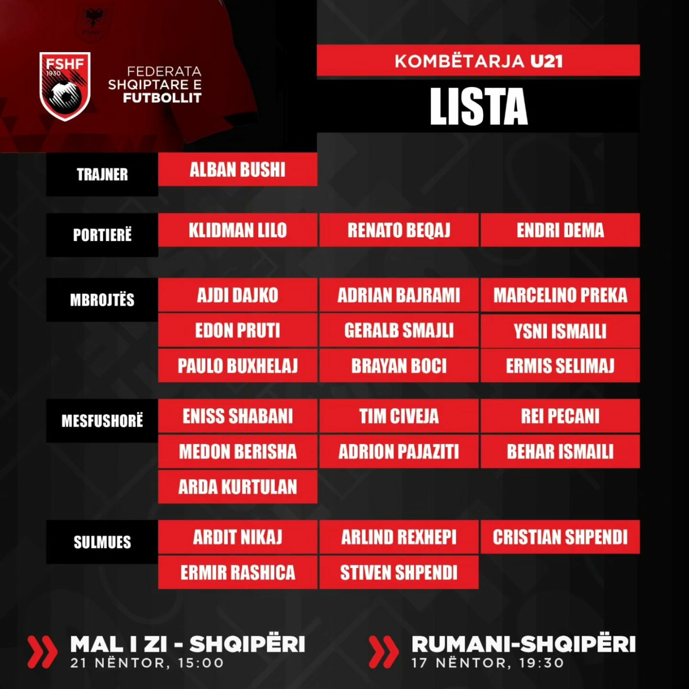 Kombëtarja e Shqipërisë u-21 luan dy ndeshje gjatë muajit nëntor për kualifikimet në Evropianin “Euro 2025”, ndaj Rumanisë dhe Malit të Zi.