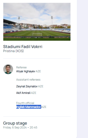 Gjyqtari kryesor i kësaj ndeshje do të jetë nga Azerbajxhani, Aliyar Aghayev.