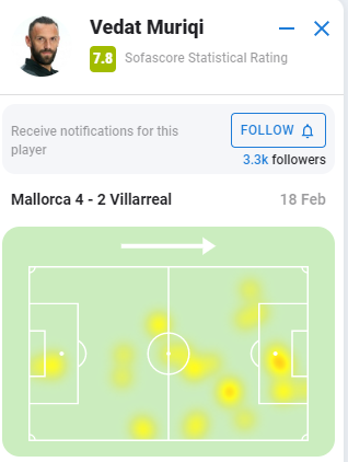 Sipas sajtit të njohur ‘Sofascore’, Vedat Muriqi ishte një nga lojtarët më të mirë në fushë. Ai kishte notën 7.8, me një gol dhe një asist – një shans të krijuar dhe 3 goditje në portë.