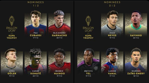 Të nominuarit janë Lamine Yamal, Pau Cubarsi, Alejandro Garnacho, Arda Guler, Karim Konate, Kobbie Mainoo, Joao Neves, Savinho, Mathys Tel dhe Warren Zaire-Emery.