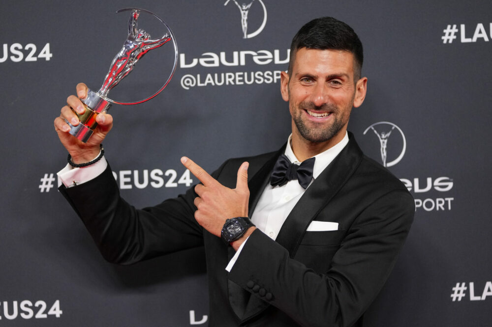 Serbian tennis player Novak Djokovic poses for the media after winning "Sportsman of the year 2024" at the Laureus Sports Awards ceremony in Madrid, Monday, April 22, 2024. (AP Photo/Manu Fernandez)