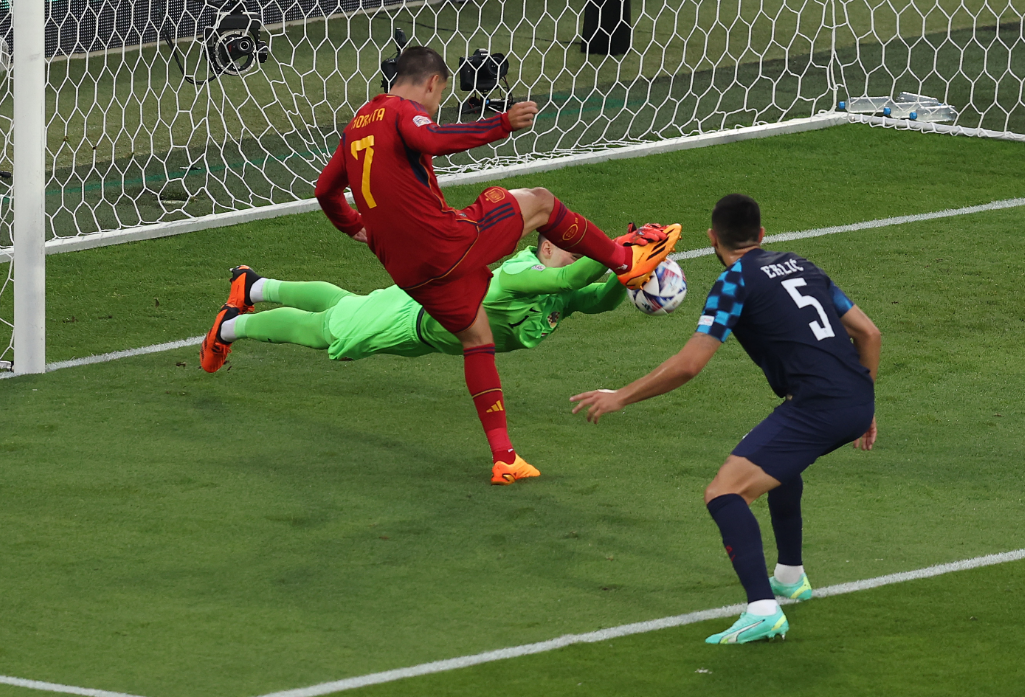 Unai Simon mbeti më i ngarkuari i dy portierëve, më së shumti në ndalimin e goditjes me kokë të Ivan Perisic nga një krosim i Luka Modric.