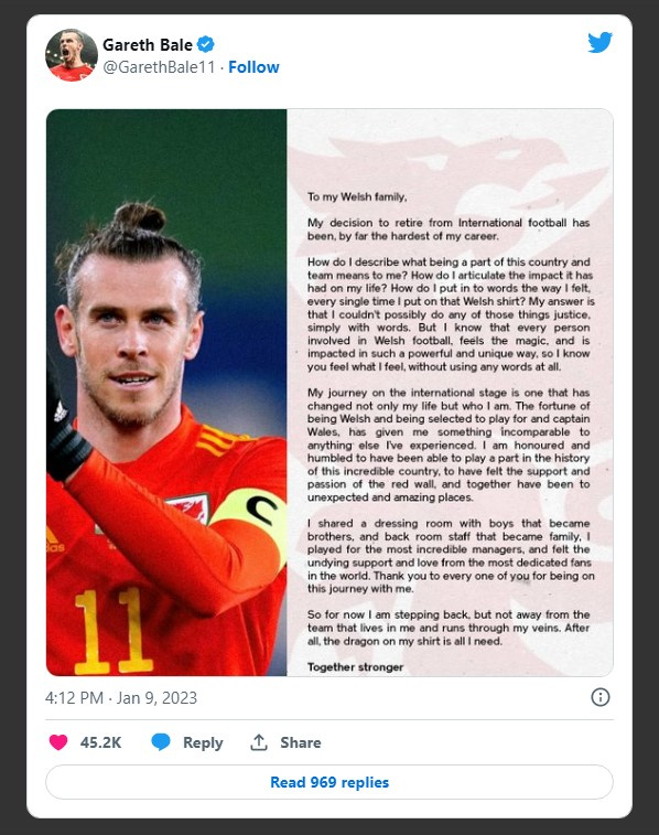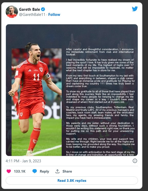 “Pas një shqyrtimi të kujdesshëm dhe të menduar, lajmëroj pensionimin e menjëhershëm nga karriera e futbollit me klube dhe me Kombëtare. Ndihem jashtëzakonisht me fat që ia kam dal që t’i realizojë ëndrrën për të luajtur sportin që e dua”, ka shkruar fillimisht në letrën e tij Bale.