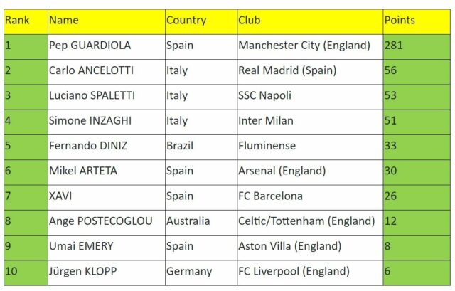 Katalanasi vazhdon të shkruajë historinë e tij në librin e futbollit, pasi ka fituar tashmë 37 trofe në 14 vjet. Pas tij me diferencë të theksuar) janë tre trajnerë italianë: Carlo Ancelotti (tashmë fitues i 3 çmimeve IFFHS 2007, 2014 dhe 2022), Luciano Spaletti dhe Simone Inzaghi. Fernando Diniz (i 5-ti) është trajneri i parë jo nga Evropa në renditjen botërore./Ss