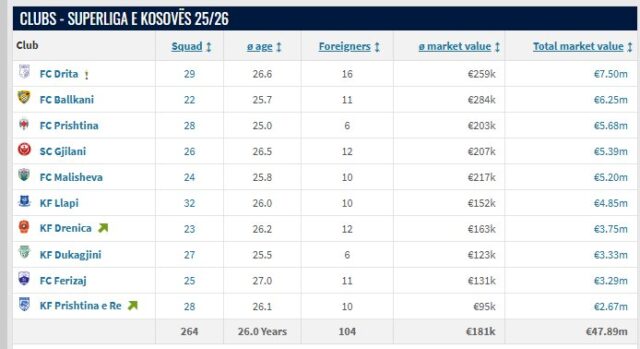 Në total sipas Trasnfermarkt, të gjitha ekipet e Superligës kanë një vlerë të përbashkët totale rreth 47.89 milionë euro./Arbresh.info