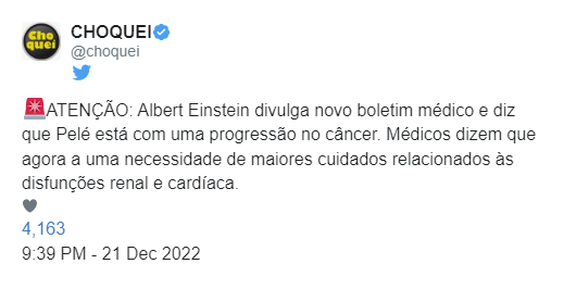 Siç njoftoi spitali i Sao Paulo, gjendja shëndetësore e Peles duket se është ende në një gjendje kritike pasi kanceri në pankreas po përparon vazhdimisht, duke rezultuar në probleme me funksionin e zemrës.