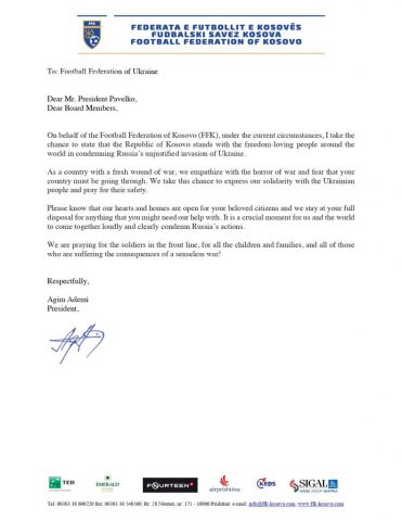 Presidenti i Federatës së Futbollit të Kosovës Agim Ademi, i ka dërguar një telegram mbështetjeje presidentit të Federatës së Futbollit të Ukrainës, Andriy Pavelko dhe tërë komunitetit të futbollit ukrainas.