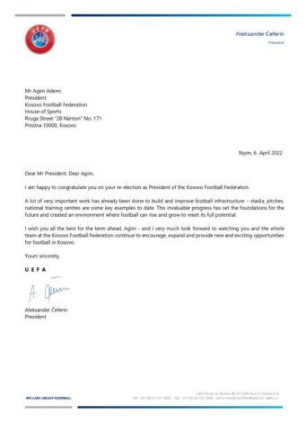 Menjëherë pas Kuvendit Zgjedhor të FFK-së, ku kryetari Agim Ademi u rikonfirmua në krye të Federatës së Futbollit të Kosovës për një mandat të ri katërvjeçar, ka arritur edhe telegram urimi i presidentit të UEFA-s, Aleksandër Ceferin.