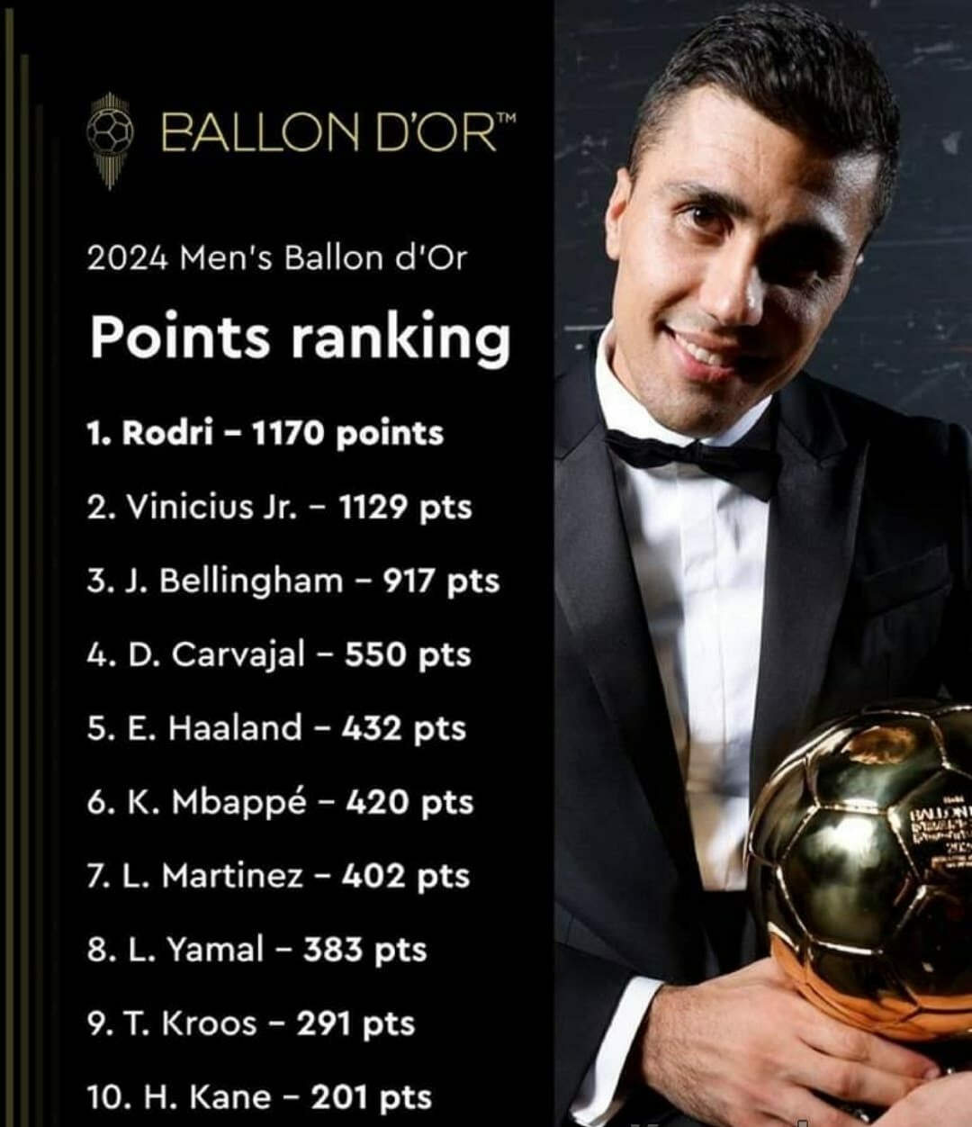 Spanjolli Rodri ka rezultuar t’i ketë 1170 pikë, apo 41 sosh më shumë se braziliani i Real Madridit, Vinicius Jr.
