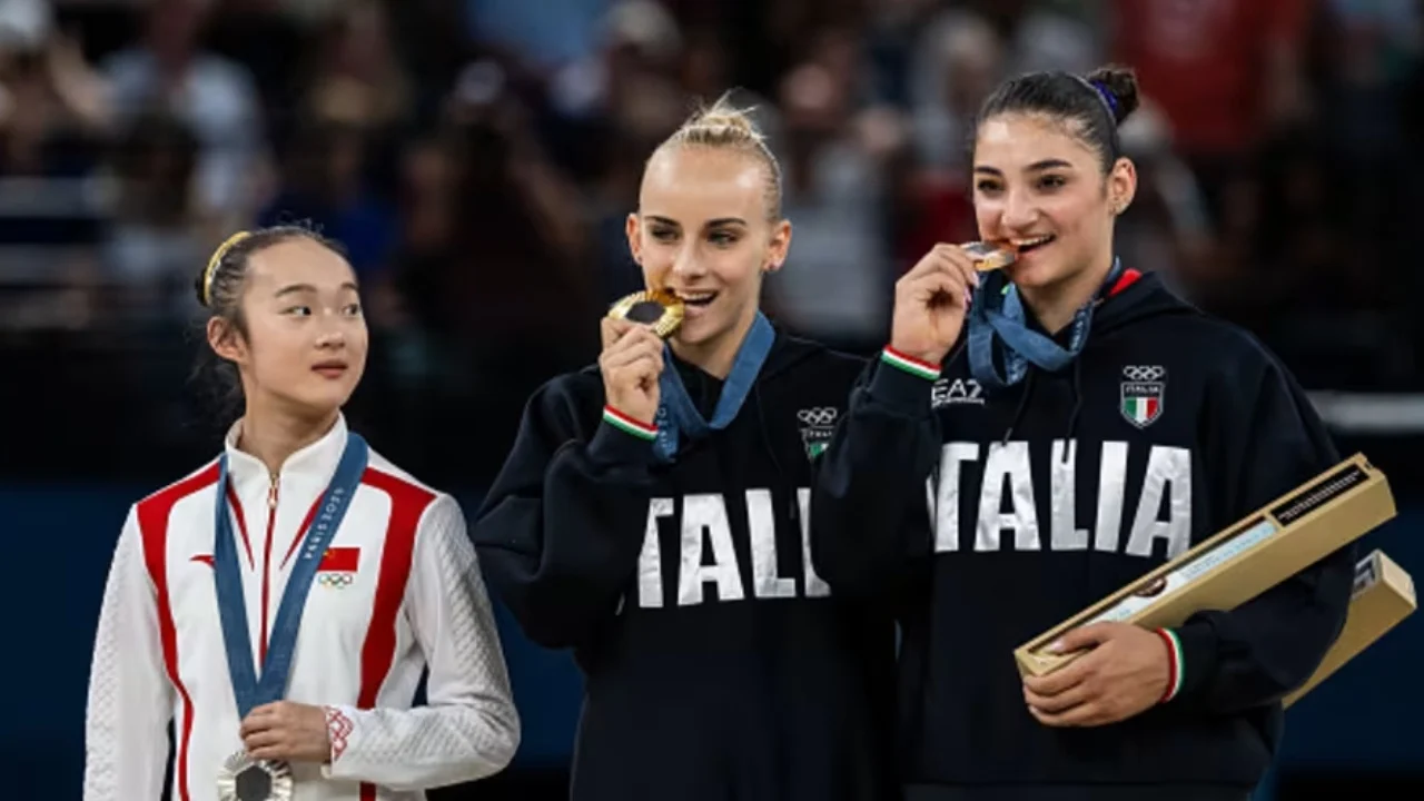 Sekuenca e imazheve është bërë virale në mediat sociale në të cilat shohim kinezen Yaqin Zhou, e argjendtë në rrezen e grave, duke vëzhguar me habi dhe më pas duke imituar italianet Alice D’Amato (ari) dhe Manila Esposito (bronz) që synojnë t’i kafshojnë medaljet. Por nga vjen ky gjest?