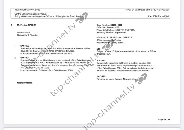 Top Channel ka siguruar dokumentin e gjykatës së ekstradimeve të Londrës, sipas së cilës bazuar në një urdhër arresti ndërkombëtarë, ka arrestuar dhe ka nxjerrë përpara trupës gjykuese e cila i ka komunikuar kuzat që vijnë nga urdhri arrestit i Greqisë.