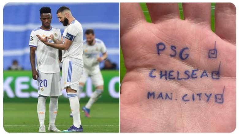 Aty shihen Benzema duke i treguar diçka në dorë Juniorit, ndërsa madrilenët i kanë shkruar emrat e klubeve si PSG, Chelsea dhe Man City, klube që i kanë eliminuar.