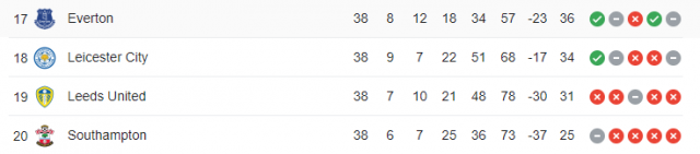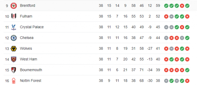 Brendford, Fulham, Crystal Palace, Chelsea, Wolves, West Ham, Bournemouth e Nottingham Forest okupojnë pozitën nga nëntë deri në 16-të.