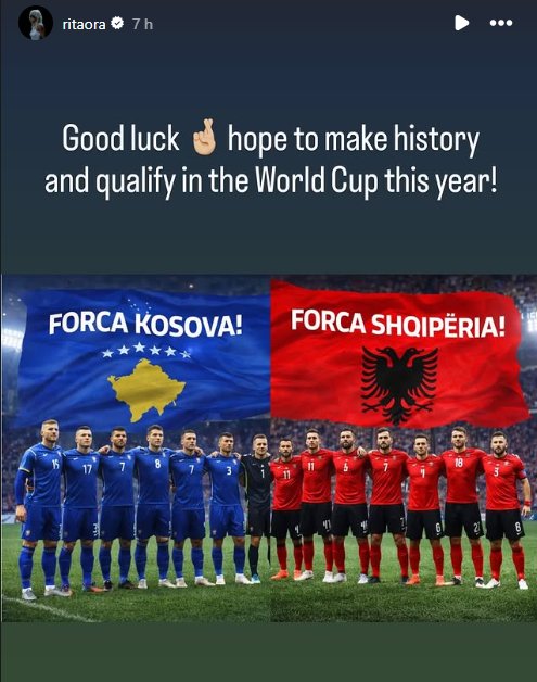 Këngëtarja me famë botërore, Rita Ora, ka shprehur mbështetjen e saj për Kosovën dhe Shqipërinë përmes një postimi në rrjetin social Instagram, në prag të ndeshjeve të rëndësishme që zhvillohen sot.
