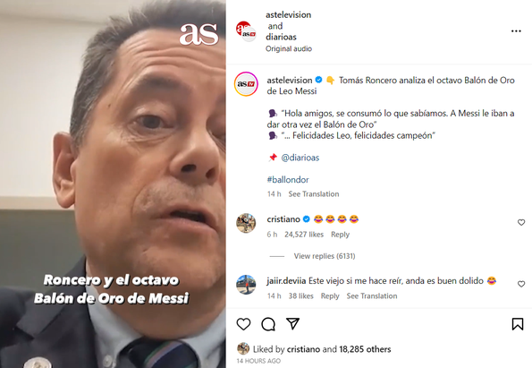 Cristiano Ronaldo nuk është prononcuar ende për mbrëmjen gala të Topit të Artë në rrjetet e tij sociale, por reagoi në një nga llogaritë e gazetës AS, që kishte publikuar një analizë të gazetarit Tomás Roncero, zëvendësdrejtor i gazetës së lartpërmendur, i cili kritikon dhënien e çmimit Lionel Messit, për të tetën herë.