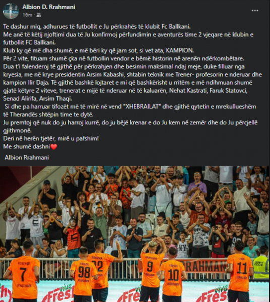 Rrahmani përmes një postimi në Facebook ka falënderuar klubin e Ballkanit për përkrahjen dhe besimin që ia kanë dhënë gjatë kësaj periudhe.